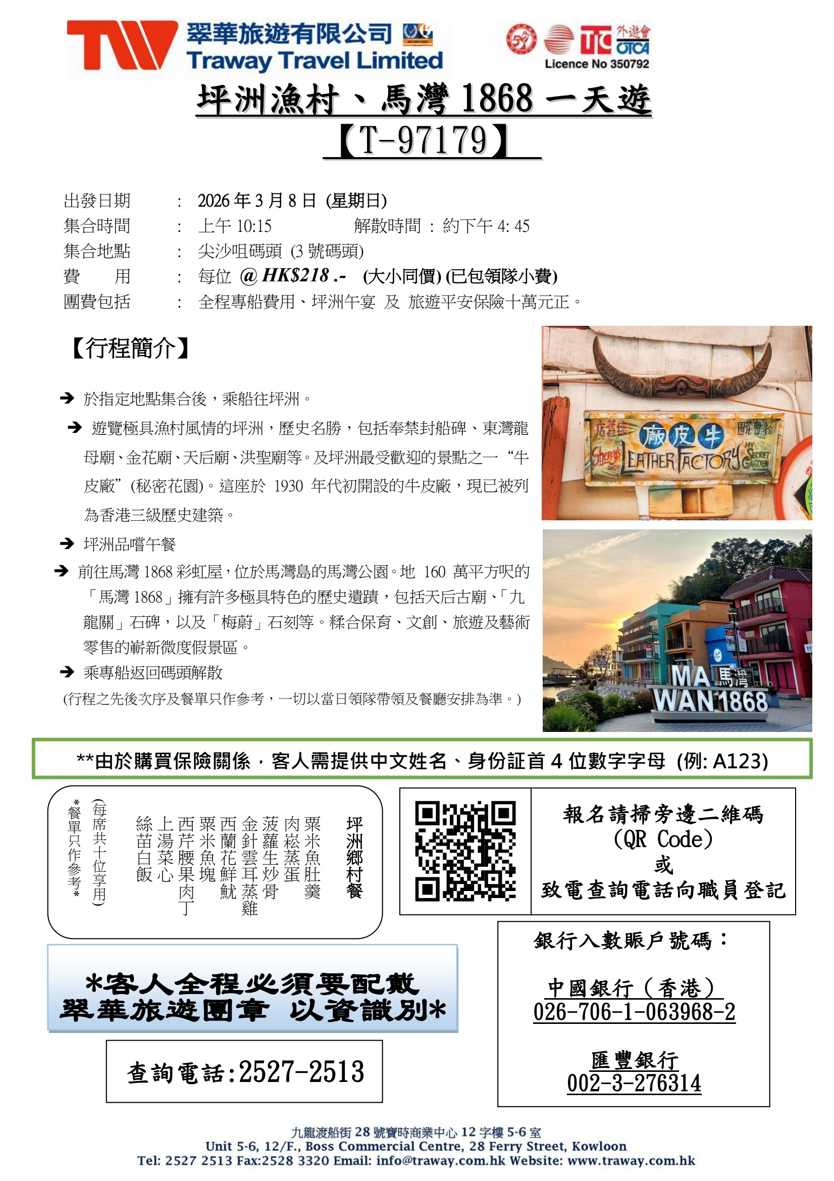 3月8號 坪洲漁村、馬灣1868一天遊來往香港仔/赤柱至蒲台島 臨時服務調整八達通卡退款安排 假如乘客懷疑自己以八達通繳船費時支付了多餘費用,需要於當日現場向本公司當值人員即時提出,否則本公司有權拒絕退款。就每張需要退款之船票,視乎目的地,本公司將收取$10-$20之退款手續費。 Tsui Wah Ferry Service HK Ltd 翠華船務 香港 有限公司 FollowFollow