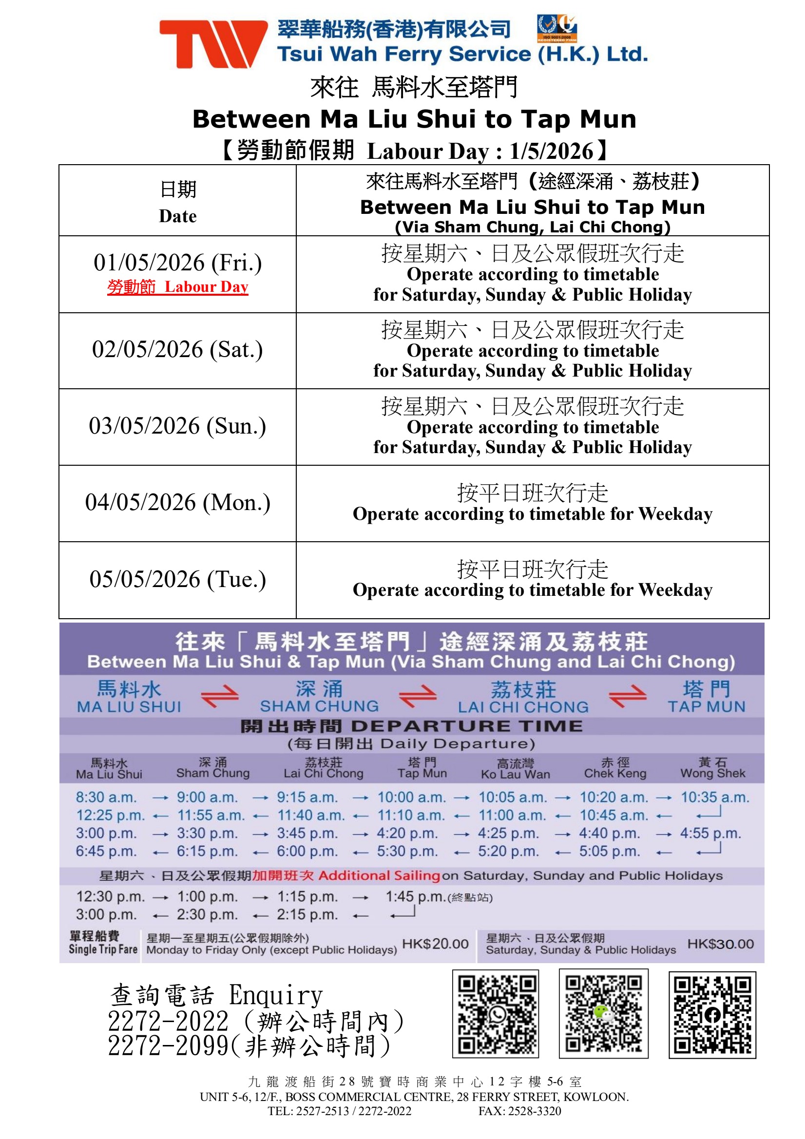 勞動節假期時間表 (1/5/2026 至 3/5/2026)