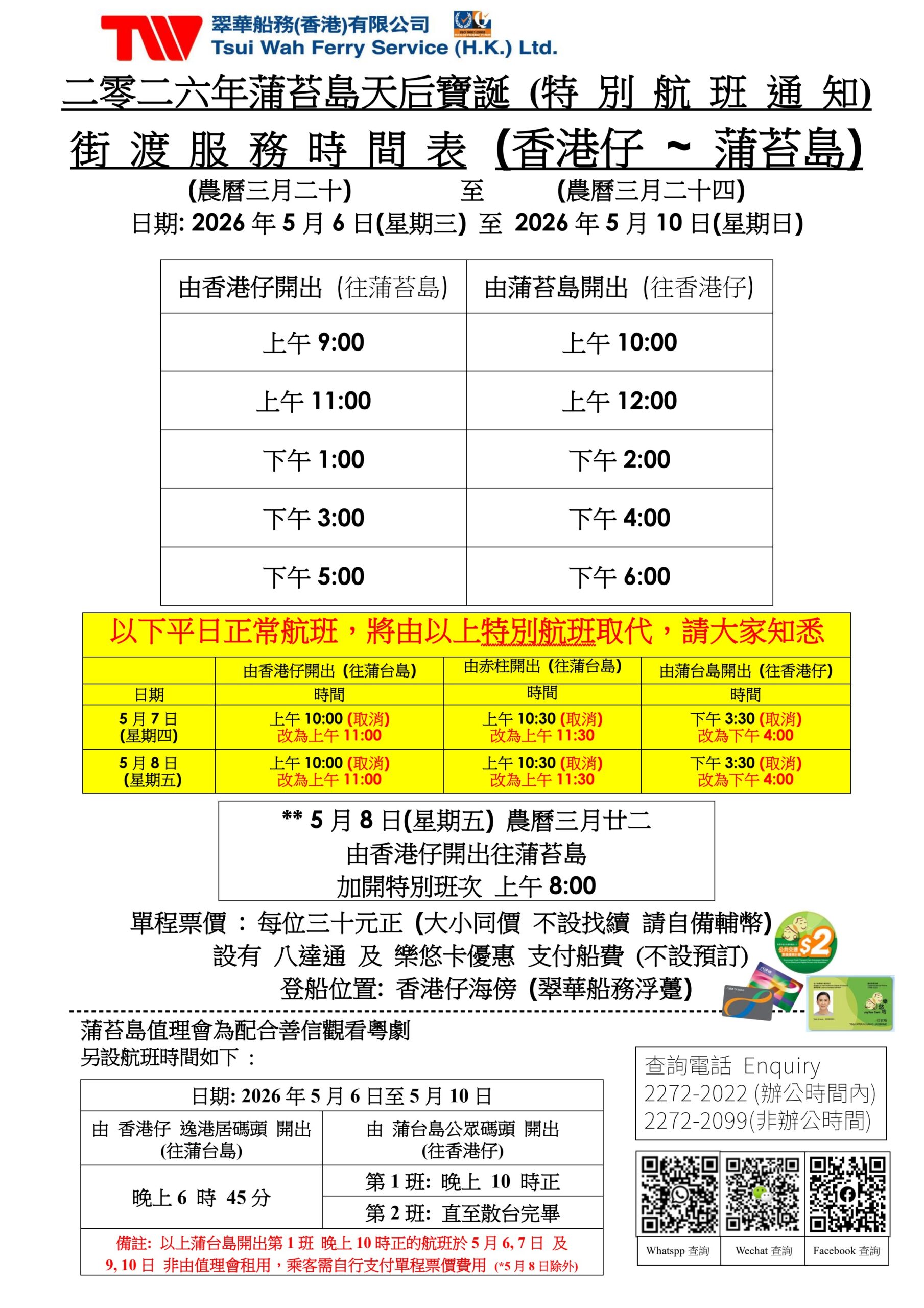 2026年蒲台島天后誕時間表來往香港仔/赤柱至蒲台島 臨時服務調整2026年夜釣墨魚 (包船)八達通卡退款安排 蒲台島天后寶誕時間表 (6/5/2026 至 10/5/2026) 請自備足夠現金,不設找續! 如有興趣包船夜釣墨魚,可以來電公司 25272513 向職員查詢詳情。 假如乘客懷疑自己以八達通繳船費時支付了多餘費用,需要於當日現場向本公司當值人員即時提出,否則本公司有權拒絕退款。就每張需要退款之船票,視乎目的地,本公司將收取$10-$20之退款手續費。 Tsui Wah Ferry Service HK Ltd 翠華船務 香港 有限公司 FollowFollow